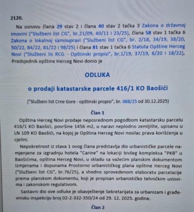 4. Građanima objasne Odluku g-dina Katića o prodaji opštinske parcele u Baošićima kompaniji Carine DOO, krajem decembra 2025, neposrednom pogodbom, i tu dokumentaciju učine javnom (Odluka SO, procjena vrijednosti zemljišta – metodologija, javni poziv…).
