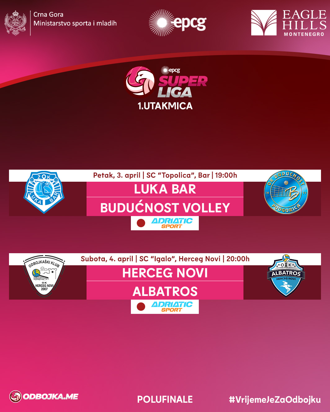 Херцег Нови и Албатрос састаће се у полуфиналу плеј-офа ЕПЦГ Суперлиге, а прва утакмица заказана је за суботу, 4. април у СЦ „Игало“ са почетком у 20 сати. Херцег Нови у овој серији брани титулу трећу сезону заредом, а у полуфинале улази након двије побједе над Гимназијалцем у четвртфиналу. У домаћем првенству овај тим није поражен 14 мјесеци, односно на 33 узастопне утакмице, а сада тражи повратак у форму након изгубљеног финала Купа од Будућности резултатом 3:2. Са друге стране, састав Албатроса је до полуфинала стигао побједама над Морачом у оба меча четвртфинала, 3:2 код куће и 3:1 у гостима. Албатрос против градског ривала ове сезоне није освојио сет, а управо против овог противника су 2023. године играли своје прво финале Купа. Реванш меч се игра наредне седмице, а пласман у финале оствариће екипа која прва упише двије побједе.
