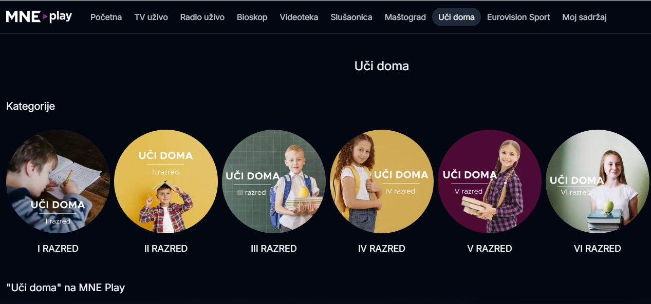 Учење, понављање школског градива, квизови и интеракција за свих девет разреда основне школе доступно је путем платформе MNE Play. Кроз обједињену верзију пројекта “Учи дома”, ученицима су сада на располагању јасно структуриране лекције по разредима и предметима, које могу пратити у било које вријеме и са било ког уређаја.