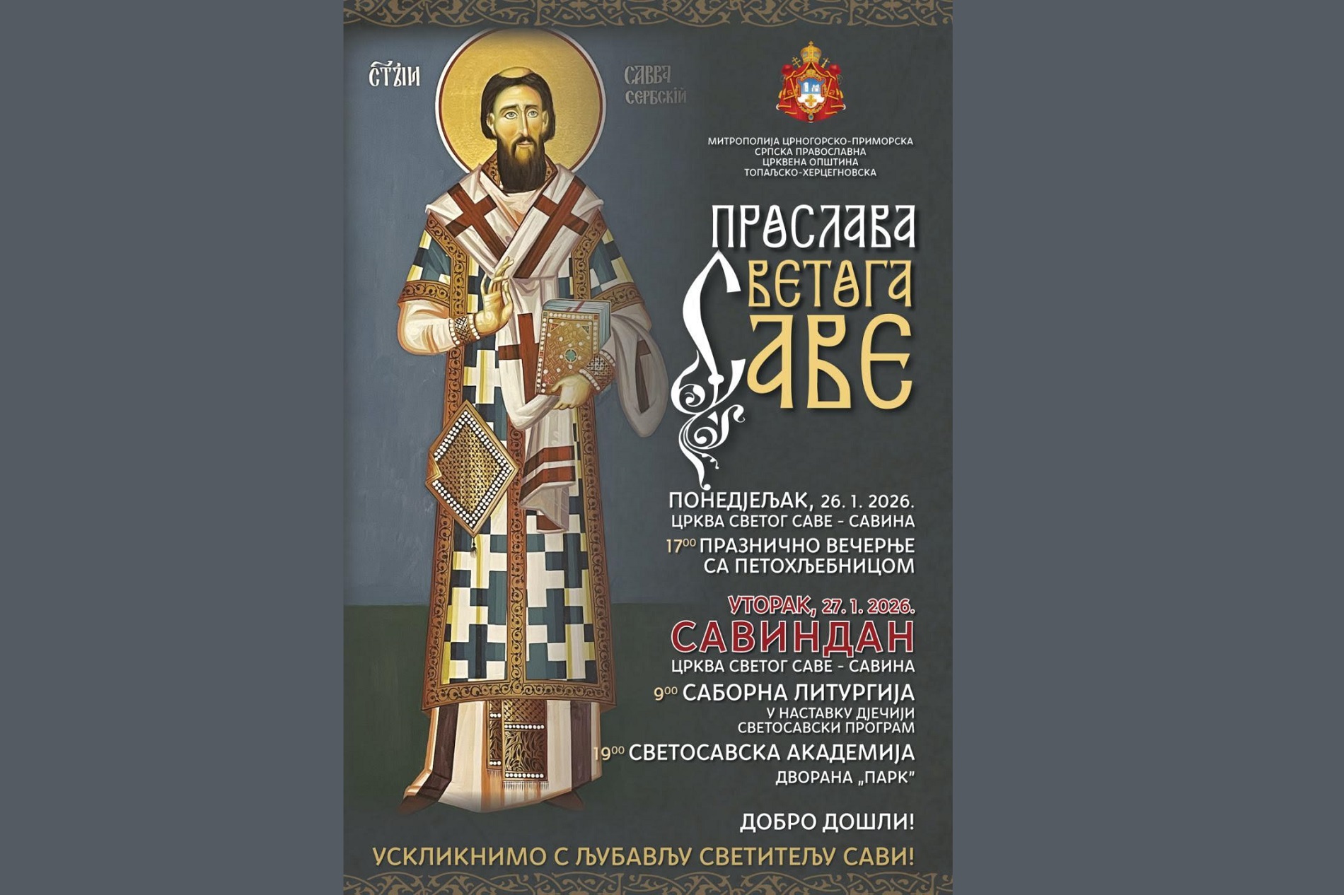 Светосавка академија биће одржана у уторак увече у 19 часова у Дворани „Парк“, а бесједиће митрополит црногорско-приморски Јоаникије. У програму учествују хорови „Свети Сава“ и „Свети Василије Острошки“, Пјевачко рецитаторска школа „Преподобна Касија Константинопољска“, солисти Душан Тадић и Нађа Милановић, професорица хармонике Босиљка Кулушић и професор гитаре Николас Морета, полазници школа вјеронаука при црквама Вазнесења Господњег, Архангела Михаила и Светог Архиђакона Стефана и КУД „Илија Кишић“.