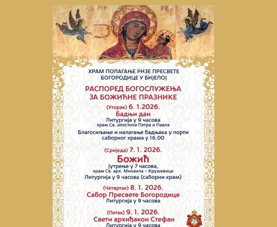Из парохије Бјељско крушевичке обавјештавају да ће на Бадњи дан у цркви светих апостола Петра и Павла литургија бити служена у 9 сати, а благосиљање и налагање бадњака у порти цркве Полагања ризе Пресвете Богородице у 16 сати. На Божић јутрење ће бити служено у 7 сати у цркви Светог архангела Михаила Бјељске Крушевице, а у литургија у саборном храму у 9 сати.