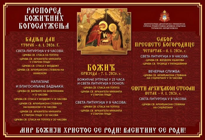 Уочи празника Рођења Христовог, биће служено божићње јутарњае у 23:00, а потом поноћна литургија у црквама Вазнесења Господњег на Топлој и храму Светог Архангела Михаила у Старом граду.