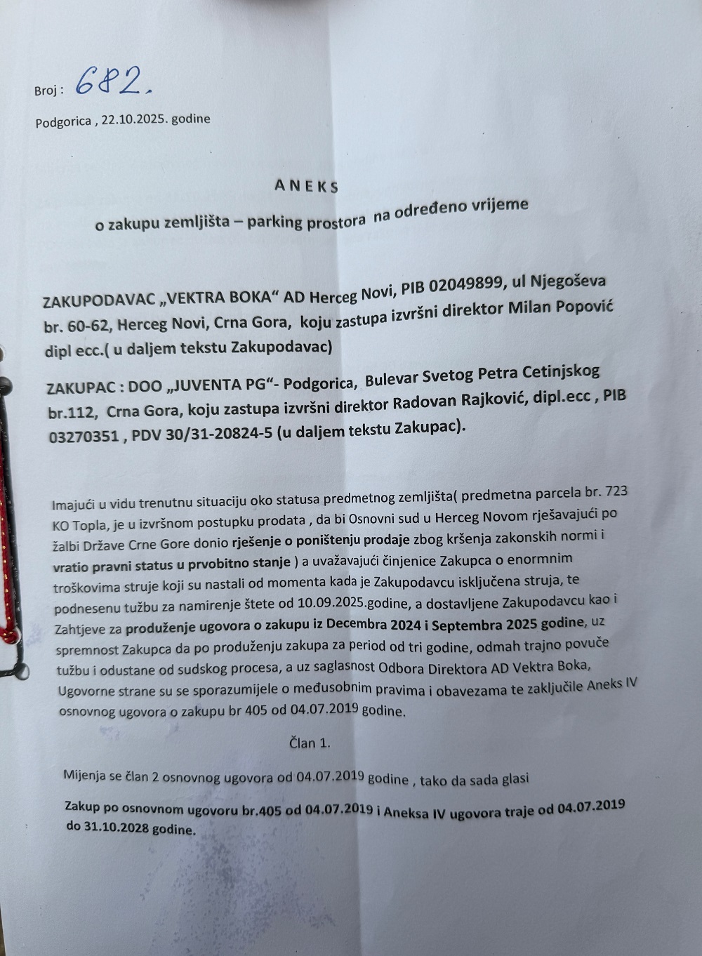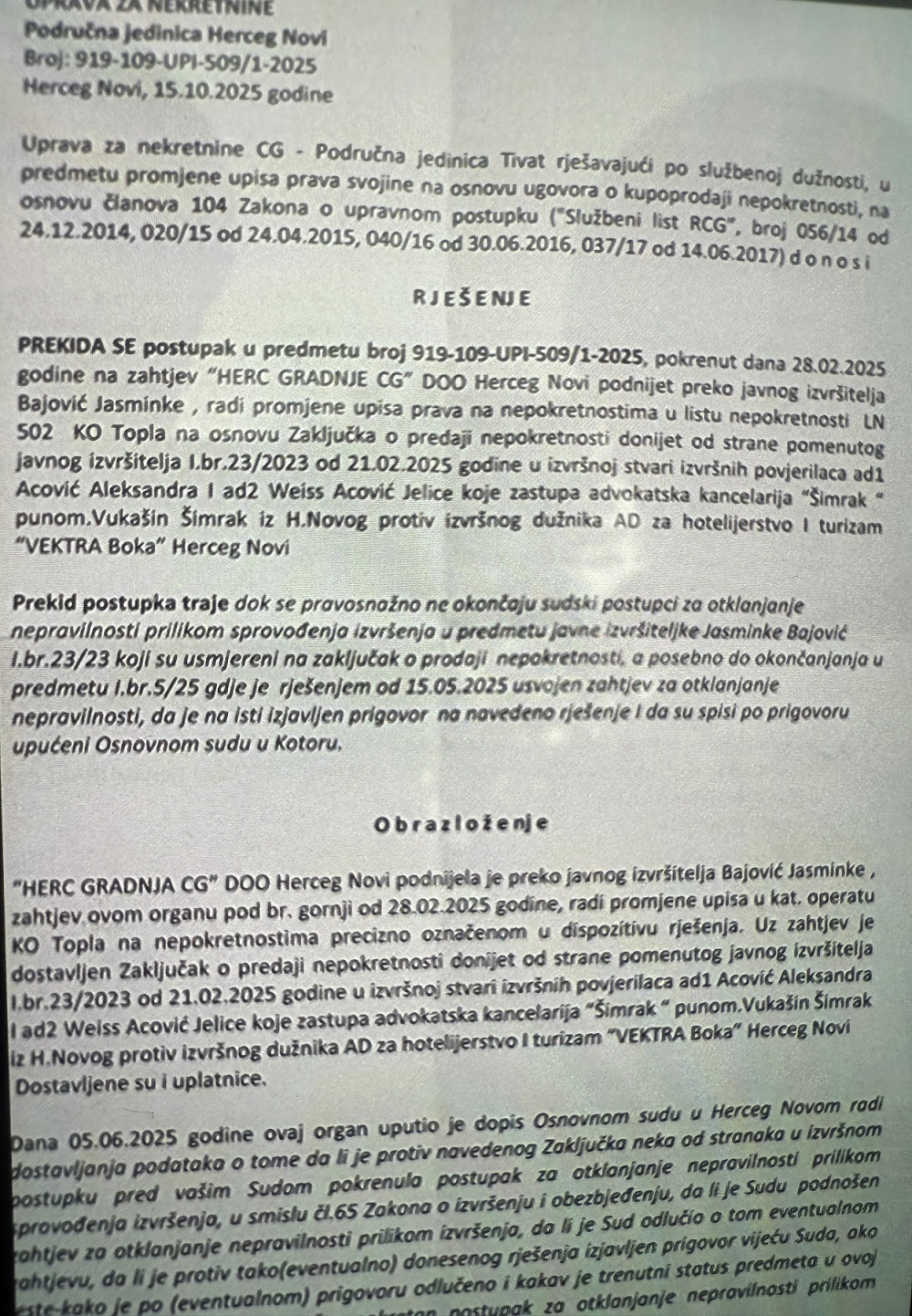 У рјешењу управе за некретнине у које смо имали увид, 15. октобра прекинут је поступак који је Херц градња покренула 28. фебруара за упис у лист непокретности. Како је наведено у рјешењу прекид траје док се правоснажно не окончају судски поступци за отклањање неправилности приликом продаје хотела Игало, па право коришћења задржава Вектра Бока. На основу рјешења управе за некретнине компанија Вектра Бока анексом је 22. октобра продужила уговор о закупу паркинг простора за компанијом Јувента ПГ до 31. октобра 2028. године. Анекс уговора овјерен је у нотарској канцеларији у Подгорици 27. октобра.