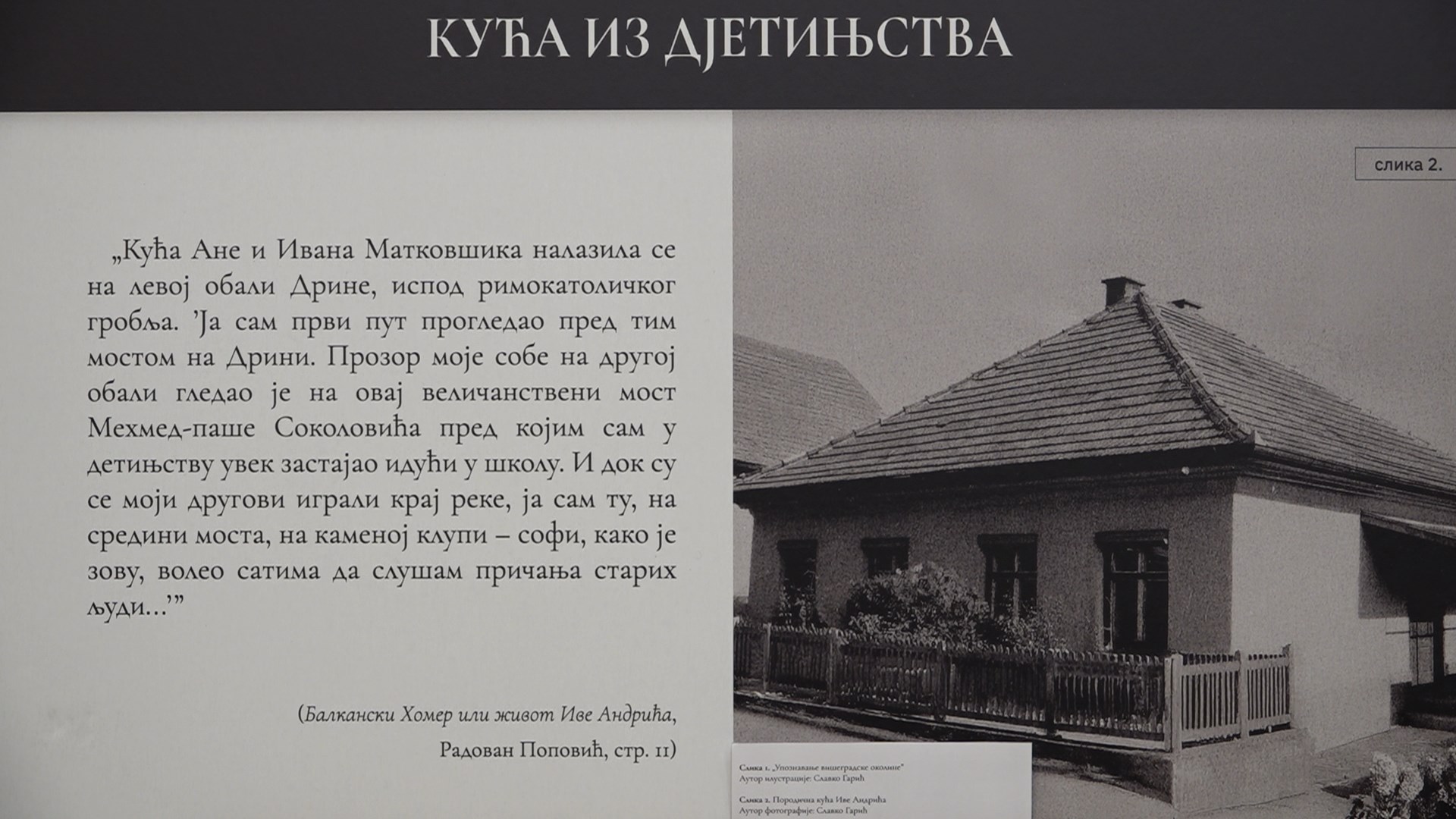 -Један дио посвећен је Андрићевом дјетињству које је провео у Вишеграду, периоду када су почеле да се формирају нераскидиве везе између писца и града. Затим смо се бавили Вишеграђанима, стварним људима које је Андрић познавао и који су били инспирација за настанак ликова из његових романа и прича. Он је с почетка чешће, а касније ређе посјећивао Вишеград и сваки пут је био срдачно дочекиван од стране својих суграђана и пријатеља. Између посјета, контакт је одржаван преписком, чему смо такође посветили један дио изложбе, рекла је она.