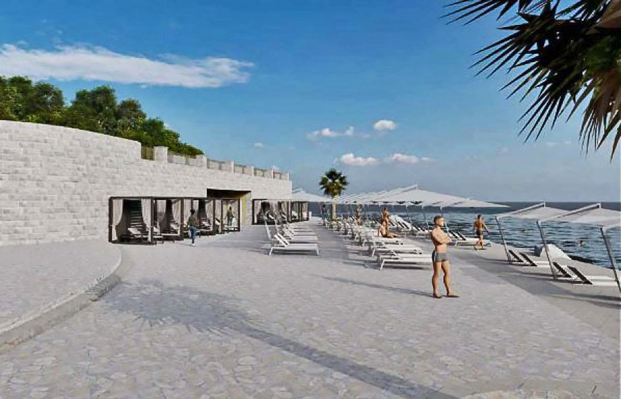 На купалишном дијелу ће бити постављене дрвене платформе, монтажне кабине за пресвлачење, мобилни тоалети, тушеви и сунцобрани са лежаљкама. Сав мобилијар и опрема биће постављени на начин који не захтијева бетонирање нити трајну измјену природног земљишта, чиме се чува постојећа морфологија терена. Комуникација корисника унутар купалишта и између зоне мора и копна биће омогућена помоћу дрвених пасарела постављених изнад тла, израђених од природних материјала отпорног на влагу и сол.